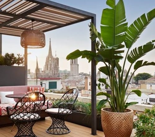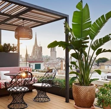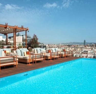 Hidden above La Rambla, this rooftop feels like a peaceful escape from the crowds below. It features a pool, lounge seating, and a relaxed ambiance.